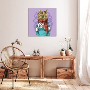 - Ilustracja kota ubranego w zimowy sweter i szalik, na fioletowym tle. Idealna dekoracja dla miłośników zwierząt i nowoczesnych wnętrz, dodająca humoru i ciepła każdemu pomieszczeniu.
