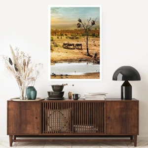 Plakat - Słonie i dzikie zwierzęta przy wodopoju o zachodzie słońca - 100x70cm - "Z Edenu zaś wypływała rzeka…" - Nowoczesna dekoracja ścienna do salonu i sypialni ARTTOR