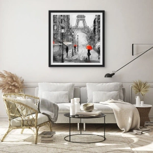 Plakat w czarnej ramie - Czarno-biała Wieża Eiffla z czerwonymi parasolami w deszczu - 50x70cm - Wszystkie drogi prowadzą do niej - Nowoczesna dekoracja ścienna do salonu i sypialni ARTTOR