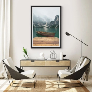• Plakat ukazujący łódź zacumowaną przy drewnianym pomoście na tle malowniczego jeziora otoczonego górami. Idealny motyw dla miłośników przyrody.