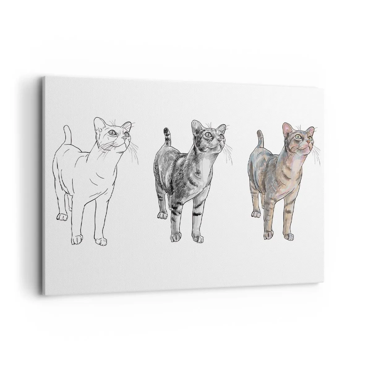 Obraz na płótnie - Ewolucja rysunku kota od szkicu do kolorowej formy - 100x70cm - Lekcja rysunku - Nowoczesna dekoracja ścienna do salonu, kuchni i sypialni ARTTOR