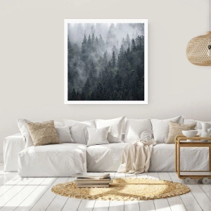 Plakat - Mglisty las iglasty w tonacji szarości i zieleni - 100x70cm - Leśny świt - Nowoczesna dekoracja ścienna do salonu i sypialni ARTTOR