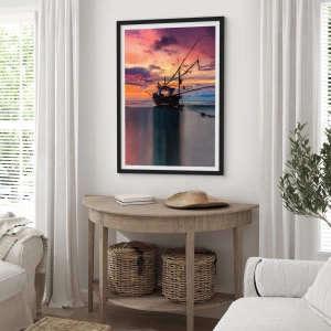 Egzotyczny wieczór to plakat, który uchwycił statek rybacki w czasie zachodu słońca. Na obrazie widać łódź, która powoli zanurza się w wodach oceanu, otoczona niesamowitymi kolorami zachodzącego słońca. Morze i piasek tworzą nastrojową przestrzeń, która zachwyca swoją prostotą, ale również intensywnością kolorów. Chmury na niebie oraz rozległe plaże dopełniają całość tej malowniczej scenerii.