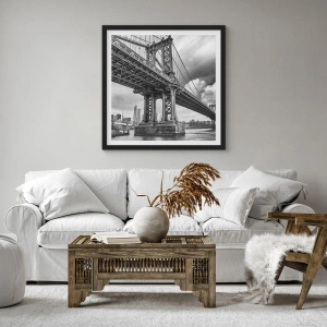 Plakat w czarnej ramie - Most w czerni i bieli na tle miejskiego krajobrazu - 50x70cm - Do serca miasta - Nowoczesna dekoracja ścienna do salonu i sypialni ARTTOR