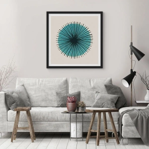 Plakat w czarnej ramie - Abstrakcyjna forma w kształcie koła z promieniami w błękitach - 100x70cm - Promieniście na błękicie - Nowoczesna dekoracja ścienna do salonu i sypialni ARTTOR