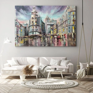 - Obraz przedstawiający klimatyczny wieczór w mieście z mokrą ulicą odbijającą światła budynków i latarni. Idealny wybór do nowoczesnych wnętrz.