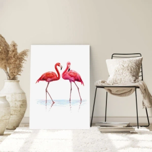 Plakat - Para flamingów w wodzie na jasnym tle - 100x70cm - Różowe randez-vous - Nowoczesna dekoracja ścienna do salonu i sypialni ARTTOR