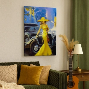 - Obraz przedstawiający kobietę w żółtej sukni ze skrzypcami stojącą obok retro samochodu na tle miasta. Stylowa kompozycja pełna elegancji i klimatu.
