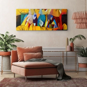 - Obraz przedstawiający kolorową abstrakcję z postaciami w geometrycznej formie. Artystyczna kompozycja wprowadza energię i wyrazistość do nowoczesnych wnętrz.