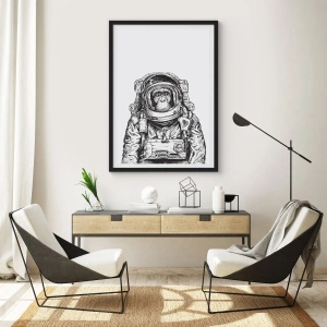 Plakat w czarnej ramie - Małpa w skafandrze kosmicznym na białym tle - 50x70cm - Alternatywna ewolucja - Nowoczesna dekoracja ścienna do salonu i sypialni ARTTOR