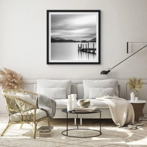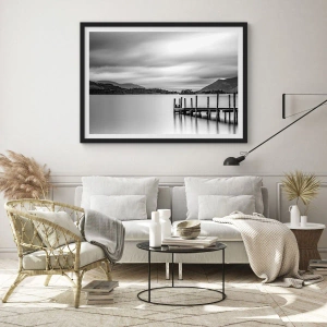 Plakat w czarnej ramie - Czarno-biała scena z jeziorem, pomostem i górami - 50x70cm - Łagodność i siła - Nowoczesna dekoracja ścienna do salonu i sypialni ARTTOR