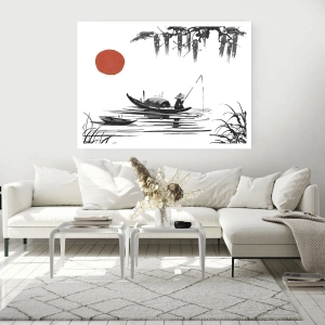 Plakat - Minimalistyczny obraz rybaka w łódce z czerwonym słońcem - 50x70cm - Azjatyckie popołudnie - Nowoczesna dekoracja ścienna do salonu, kuchni i sypialni ARTTOR