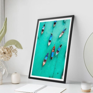 • Plakat ukazujący łodzie rybackie na turkusowej wodzie z lotu ptaka. Harmonijna kompozycja wprowadza do wnętrz spokój i egzotyczny klimat.