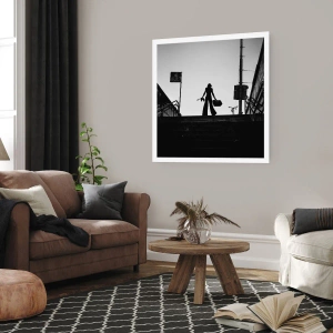 Plakat - Sylwetka kobiety z walizką na tle zachodzącego słońca - 50x70cm - Miejska wędrówka - Nowoczesna dekoracja ścienna do salonu, kuchni i sypialni ARTTOR