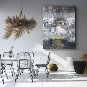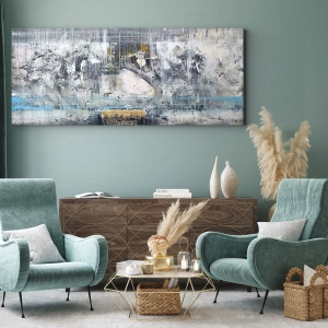 - Obraz przedstawia abstrakcyjną kompozycję w chłodnych tonacjach szarości i błękitu. Idealny do nowoczesnych wnętrz, które cenią minimalizm i wyrazistą sztukę.