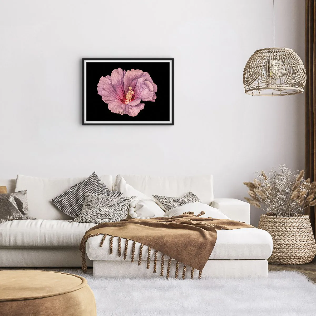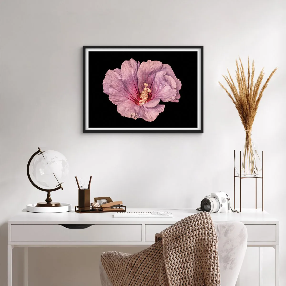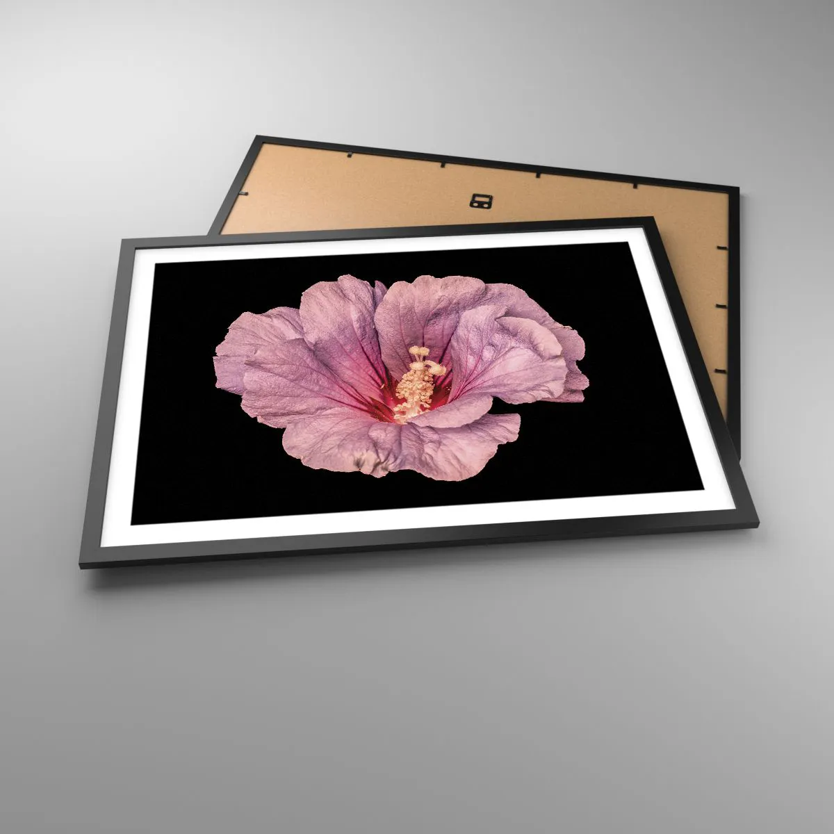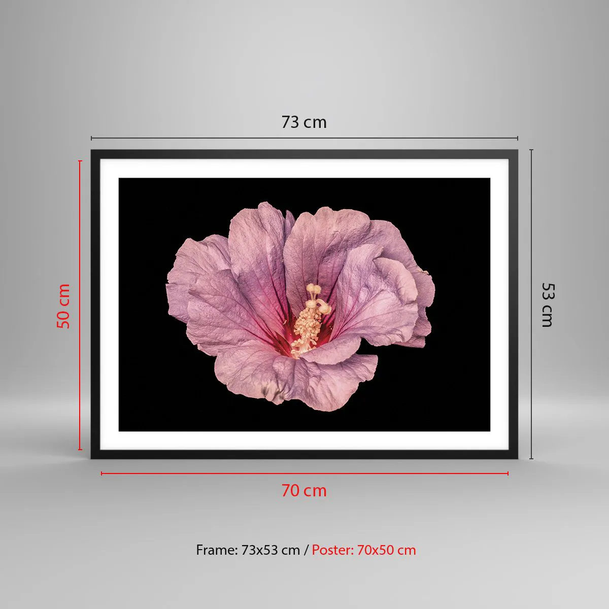 Plakat w czarnej ramie - Różowy kwiat na czarnym tle - 70x50cm - Prosto do serca - Nowoczesna dekoracja ścienna do salonu i sypialni ARTTOR