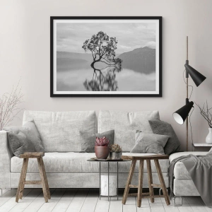 Plakat w czarnej ramie - Samotne drzewo odbijające się w wodzie na tle gór - 70x50cm - Jest taki kraj - Nowoczesna dekoracja ścienna do salonu i sypialni ARTTOR