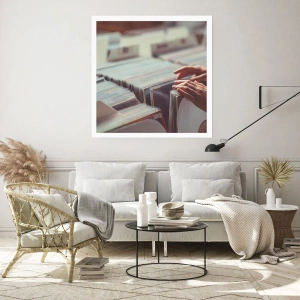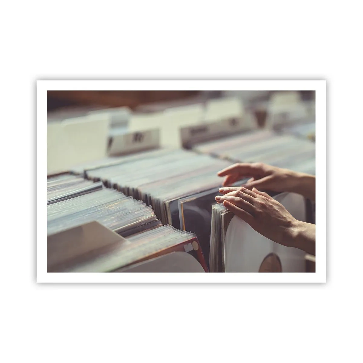 Plakat - Ręce przeglądające kolekcję winyli - 100x70cm - W poszukiwaniu wzruszeń - Nowoczesna dekoracja ścienna do salonu i sypialni ARTTOR
