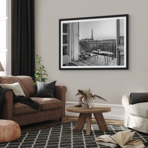 Plakat w czarnej ramie - Widok na wieżę Eiffla z balkonu z leżakami i stolikiem - 100x70cm - Paryskie popołudnie - Nowoczesna dekoracja ścienna do salonu i sypialni ARTTOR