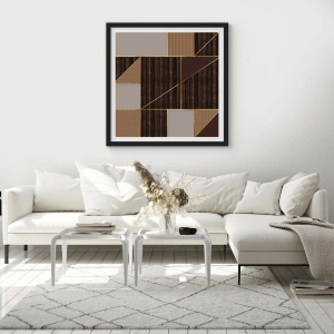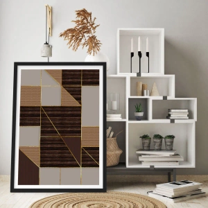 Plakat w czarnej ramie - Geometryczne wzory w odcieniach brązu ze złotymi liniami - 70x50cm - Mozaika brązów i złota - Nowoczesna dekoracja ścienna do salonu i sypialni ARTTOR