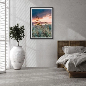 Plakat w czarnej ramie - Pomost nad morzem otoczony trawą podczas zachodu słońca - 50x70cm - Nie przemija z wiatrem - Nowoczesna dekoracja ścienna do salonu i sypialni ARTTOR
