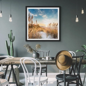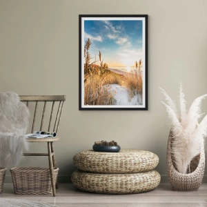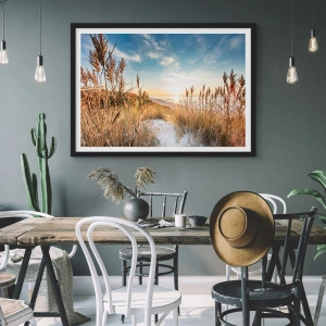 Plakat w czarnej ramie - Malownicza plaża z trawami i zachodzącym słońcem - 70x50cm - Północna plaża - Nowoczesna dekoracja ścienna do salonu i sypialni ARTTOR