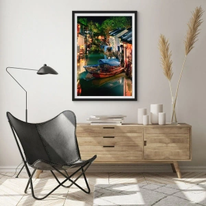 Plakat w czarnej ramie - Nocny widok na kanały z tradycyjnymi łodziami i domami - 70x50cm - Wieczór na chińskiej ulicy - Nowoczesna dekoracja ścienna do salonu i sypialni ARTTOR
