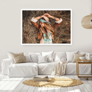 Plakat - Kobieta w stylu boho leżąca na sianie - 100x70cm - W drodze do lata miłości - Nowoczesna dekoracja ścienna do salonu i sypialni ARTTOR