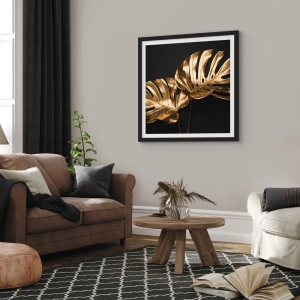 Plakat w czarnej ramie - Złote liście monstery na czarnym tle, elegancki kontrast kolorów - 50x70cm - Skarby natury - Nowoczesna dekoracja ścienna do salonu i sypialni ARTTOR