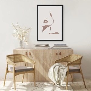 - Plakat z minimalistycznym portretem twarzy w odcieniach beżu i brązu. Doskonały jako subtelna dekoracja wnętrz. Produkt zawiera czarną ramę o wymiarach 50x70 cm.