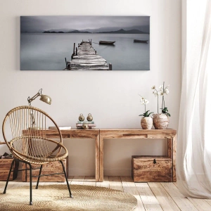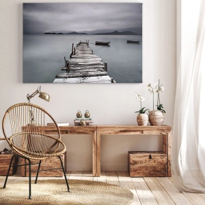 Centralnym punktem obrazu jest drewniany pomost, który dzięki swojej surowości i prostocie symbolizuje podróż i otwartość na nieznane. W tle widać spokojne jezioro, którego powierzchnia odbija szare niebo, nadając całości harmonijny charakter. Delikatne zarysy łodzi dodają kompozycji subtelnego uroku i tajemniczości.