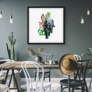 Plakat w czarnej ramie - Czarna pantera w otoczeniu tropikalnych liści - 70x50cm - Dzikość serca - Nowoczesna dekoracja ścienna do salonu i sypialni ARTTOR