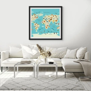 Plakat w czarnej ramie - Mapa świata z ilustracjami zwierząt - 70x50cm - Dobrzy sąsiedzi - Nowoczesna dekoracja ścienna do salonu i sypialni ARTTOR
