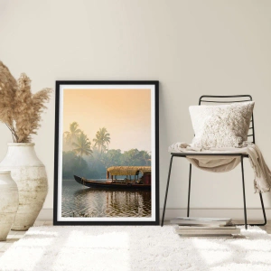 - Plakat przedstawia tradycyjną łódź na rzece otoczoną palmami w ciepłym świetle zachodu słońca. Doskonale sprawdzi się jako dekoracja do salonu lub sypialni. Czarna rama podkreśla elegancję obrazu.