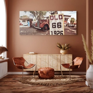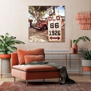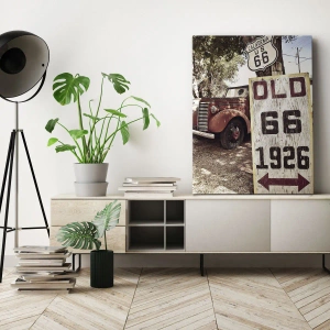 Obraz na płótnie - Retro samochód i znak Route 66 w rustykalnym otoczeniu - 100x70cm - Legenda amerykanskiej prowincji - Nowoczesna dekoracja ścienna do salonu, kuchni i sypialni ARTTOR