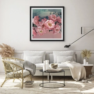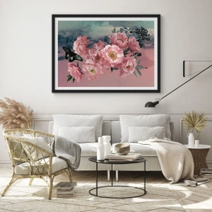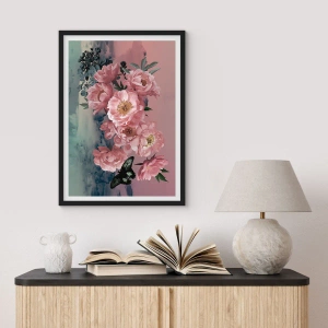 Plakat w czarnej ramie - Różowe piwonie z motylem na pastelowym tle - 70x50cm - Szczyt romantyzmu - Nowoczesna dekoracja ścienna do salonu i sypialni ARTTOR