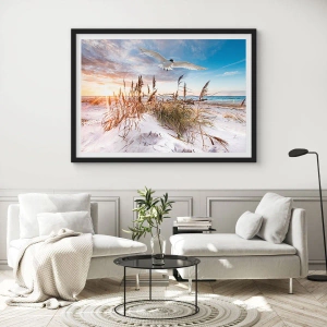 "Wiatr od morza" to piękny plakat ukazujący harmonię przyrody w wyjątkowej scenerii. Ptak w locie majestatycznie unosi się nad wydmami pokrytymi trawami, a w tle rozciąga się spokojne morze oświetlone ciepłymi promieniami zachodzącego słońca. Ta scena wprowadza do wnętrza atmosferę spokoju i relaksu, idealną do salonu, sypialni lub biura.