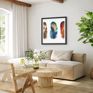 Plakat w czarnej ramie - Trzy kolorowe pióra z artystycznymi wzorami na jasnym tle - 100x70cm - Rytuały, obrzędy, tajemnice - Nowoczesna dekoracja ścienna do salonu i sypialni ARTTOR