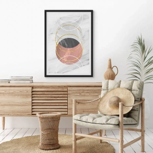 Plakat w czarnej ramie - Abstrakcyjna kompozycja z okręgami i złotymi akcentami - 50x70cm - Muzyka sfer - Nowoczesna dekoracja ścienna do salonu i sypialni ARTTOR