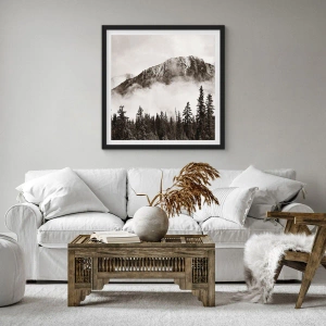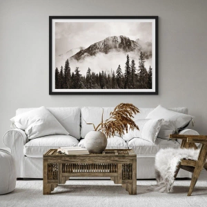 Plakat w czarnej ramie - Malowniczy szczyt górski otoczony mgłą i lasem w odcieniach sepia - 100x70cm - Granitowy władca - Nowoczesna dekoracja ścienna do salonu i sypialni ARTTOR