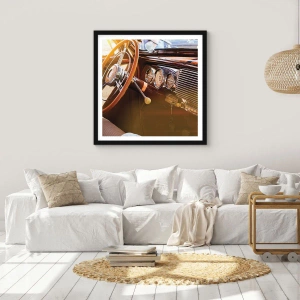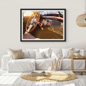 Plakat w czarnej ramie - Zbliżenie na wnętrze klasycznego samochodu z drewnianymi i chromowanymi detalami - 70x50cm - Powiew luksusu z przeszłości - Nowoczesna dekoracja ścienna do salonu i sypialni ARTTOR