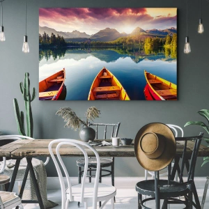 Obraz na ścianę - Górskie jezioro o zachodzie słońca - Trzy drewniane łodzie na tle górskiego jeziora o zachodzie słońca