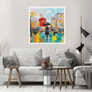 Plakat - Malownicza scena z parasolem na tle Paryża w żywych kolorach - 100x70cm - Paryskie legendy - Nowoczesna dekoracja ścienna do salonu i sypialni ARTTOR