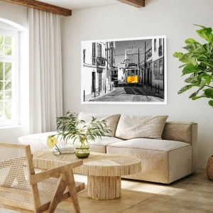 Plakat - Żółty tramwaj na ulicach Lizbony w monochromatycznej scenerii - 100x70cm - Duch Lizbony - Nowoczesna dekoracja ścienna do salonu i sypialni ARTTOR