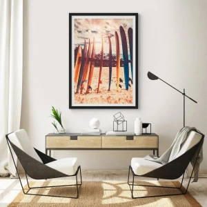 Plakat w czarnej ramie - Deski surfingowe na plaży o zachodzie słońca - 100x70cm - Dobranoc, do jutra - Nowoczesna dekoracja ścienna do salonu i sypialni ARTTOR