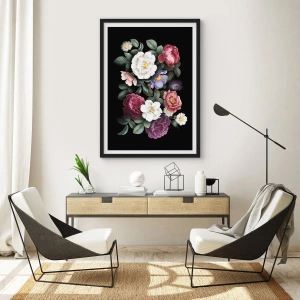 Plakat w czarnej ramie - Bukiet kwiatów na czarnym tle w stylu vintage - 50x70cm - Z angielskiego ogrodu - Nowoczesna dekoracja ścienna do salonu i sypialni ARTTOR