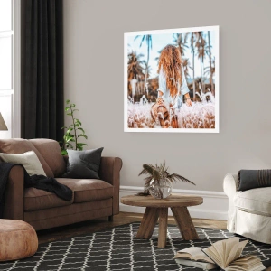 Plakat - Kobieta w białej koszuli spacerująca wśród palm - 50x70cm - Zrodzona z puchu traw - Nowoczesna dekoracja ścienna do salonu, kuchni i sypialni ARTTOR
