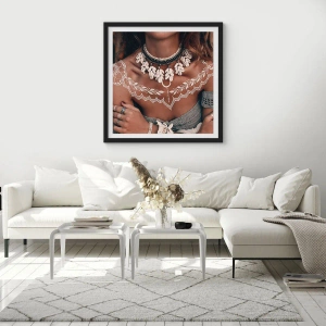 Plakat w czarnej ramie - Portret kobiety z muszlowym naszyjnikiem i białym tatuażem - 50x70cm - Talizmany, rytuały kobiecości - Nowoczesna dekoracja ścienna do salonu i sypialni ARTTOR