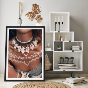 - Plakat przedstawia portret kobiety ozdobionej muszlowym naszyjnikiem i białym tatuażem na skórze. Ciepłe barwy i subtelne detale nadają kompozycji artystyczny, boho i etniczny charakter.