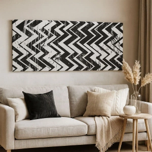 - Obraz na płótnie z wyrazistym czarno-białym wzorem w zygzaki, z artystycznymi przetarciami, idealny do nowoczesnych wnętrz.